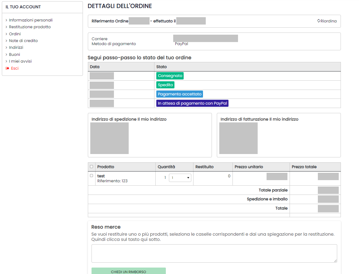 Il cliente può accedere alla richiesta di reso in caso di ordine effettuato con o senza registrazione al sito.