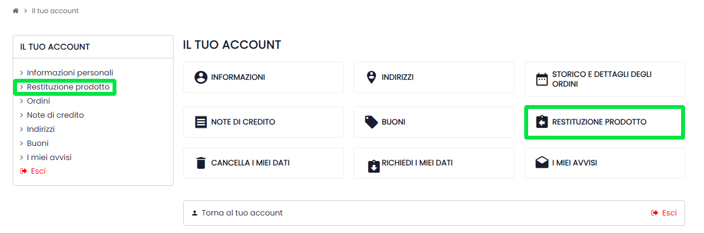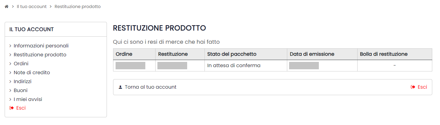 Puoi accedere a questa schermata anche cliccando su “RESTITUZIONE PRODOTTO” dalla propria area cliente